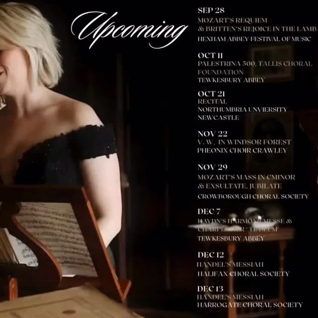 Recent highlights of her latest season include Mozart’s Requiem at Hexham Abbey Music Festival, Tilford Bach Festival, Mahler’s Symphony No. 4, Bach’s St John Passion, Beethoven’s 9th Symphony, Fauré’s Requiem and Mozart’s Solemn Vespers at Worcester Cathedral.